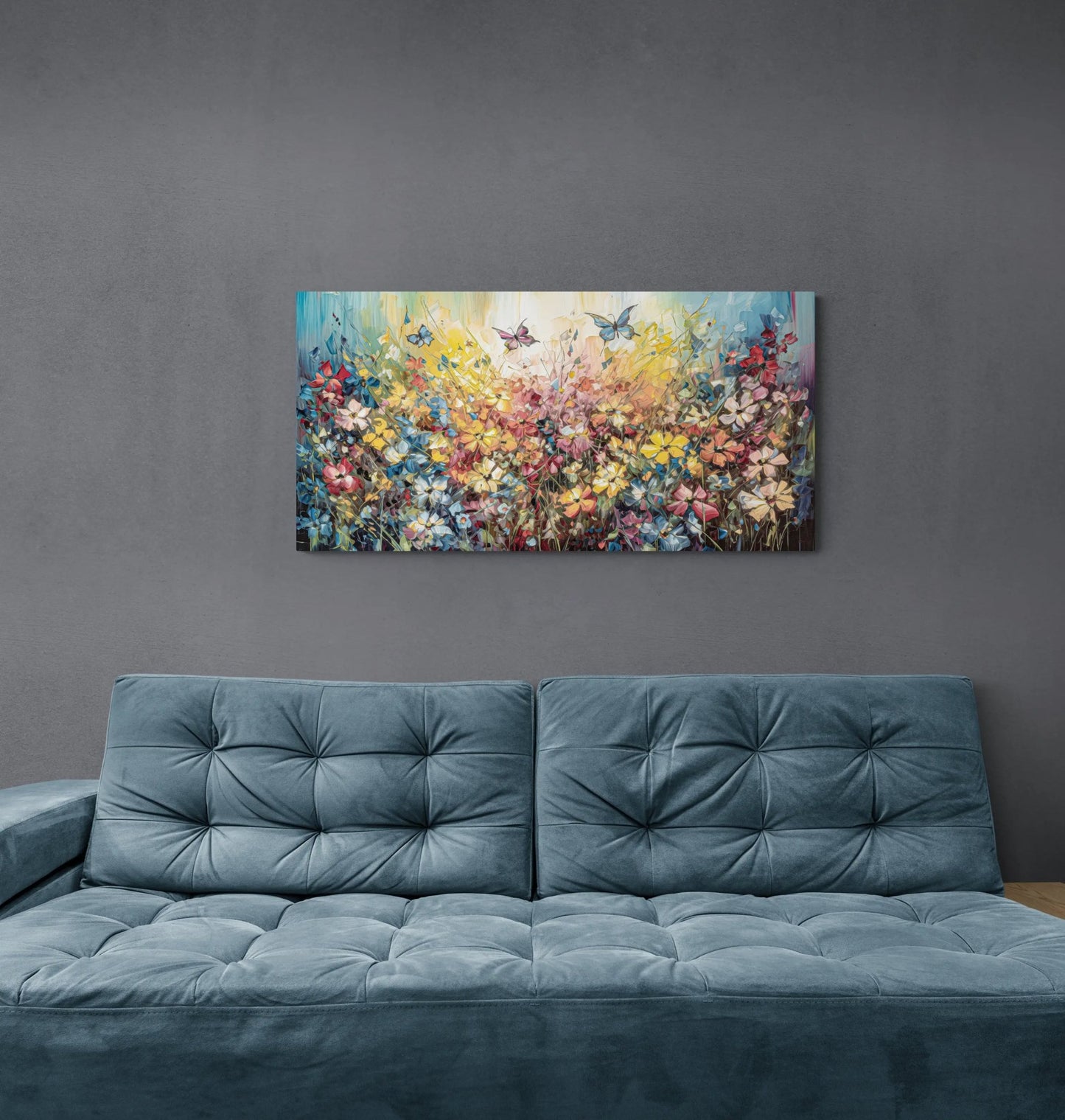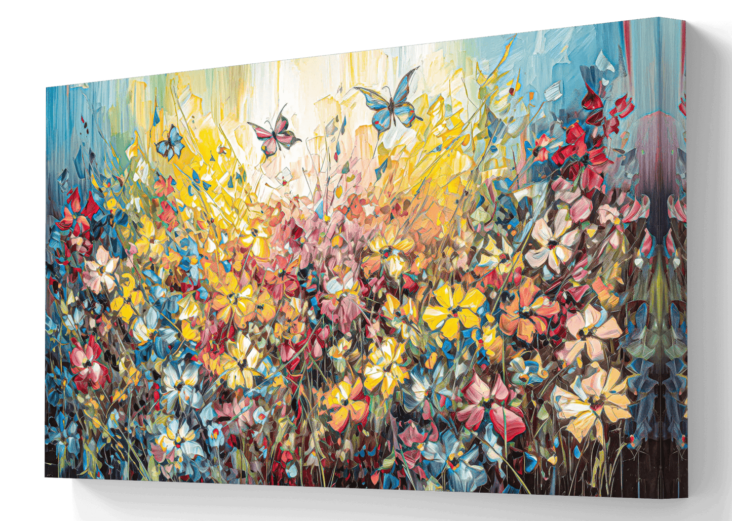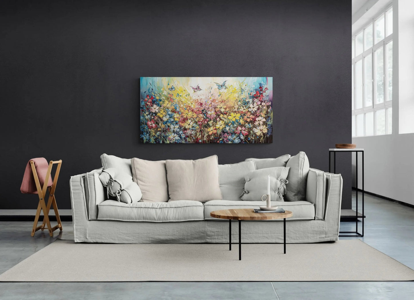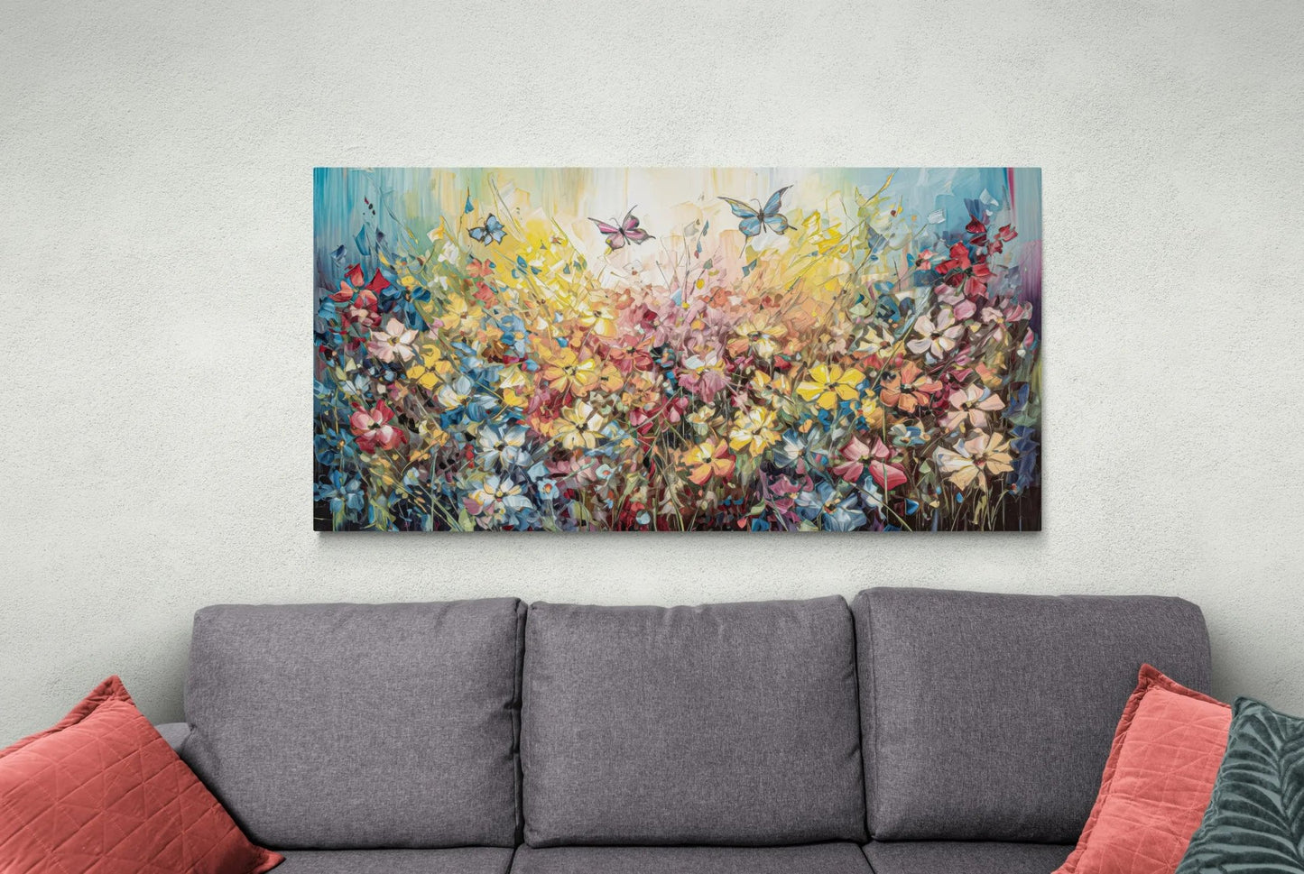 Laat je interieur stralen met "Veld van Vreugde", een kunstwerk dat een levendige explosie van kleuren en energie brengt. Dit canvas, vol met prachtige bloemen in felle tinten en omringd door dansende vlinders, is een viering van de schoonheid en levendigheid van de natuur. Het brengt licht, vreugde en een gevoel van positiviteit in elke ruimte.