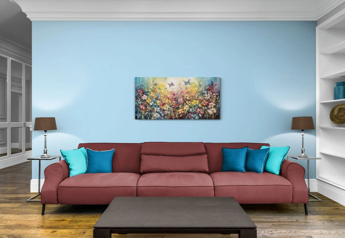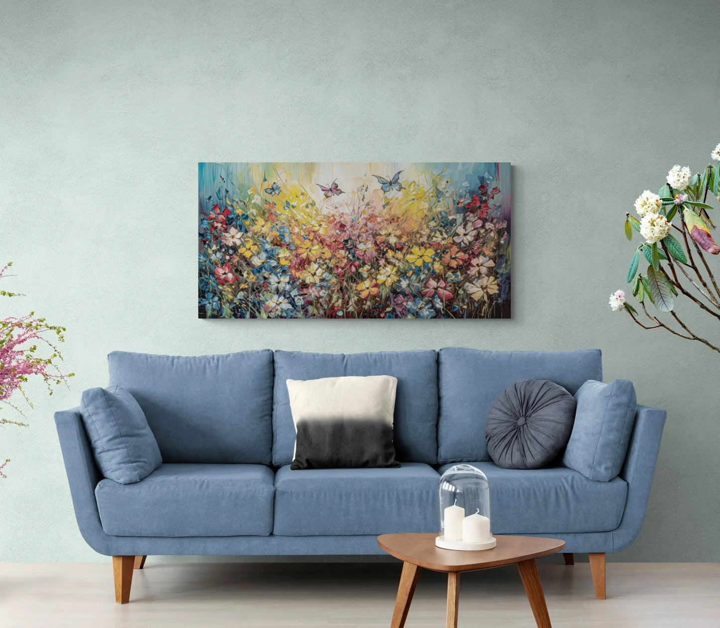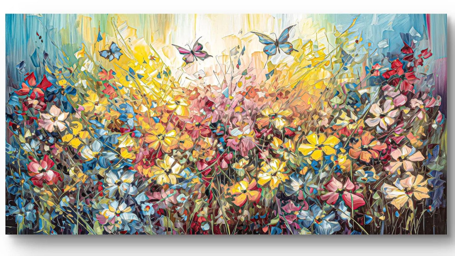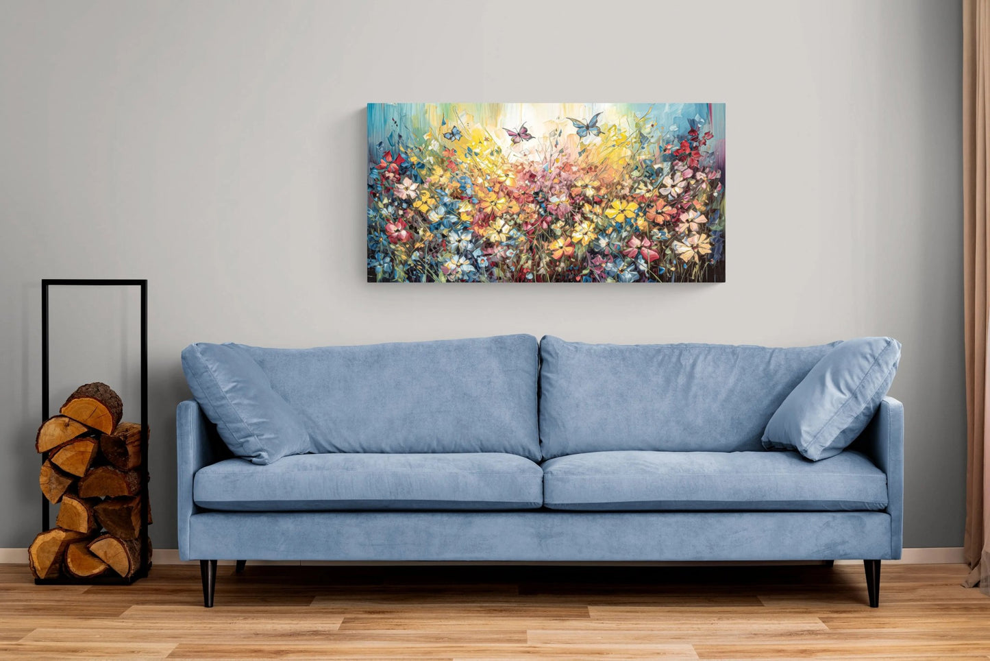 Laat je interieur stralen met "Veld van Vreugde", een kunstwerk dat een levendige explosie van kleuren en energie brengt. Dit canvas, vol met prachtige bloemen in felle tinten en omringd door dansende vlinders, is een viering van de schoonheid en levendigheid van de natuur. Het brengt licht, vreugde en een gevoel van positiviteit in elke ruimte.