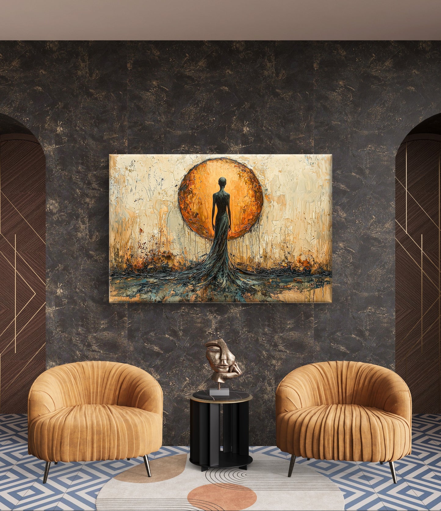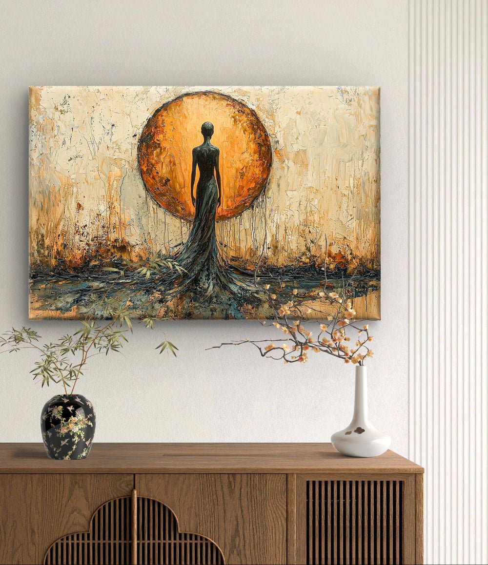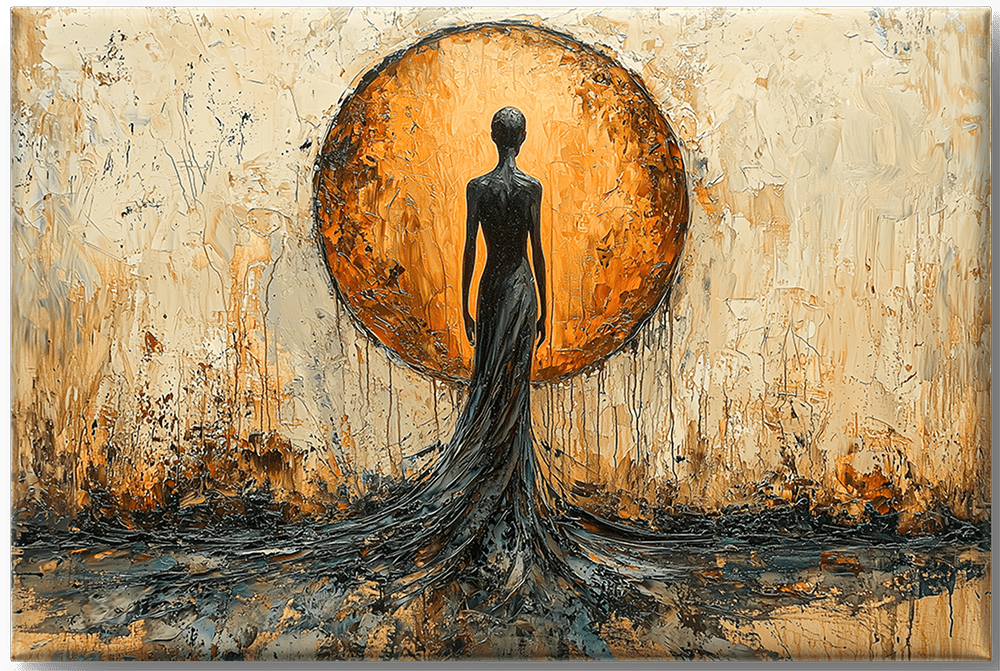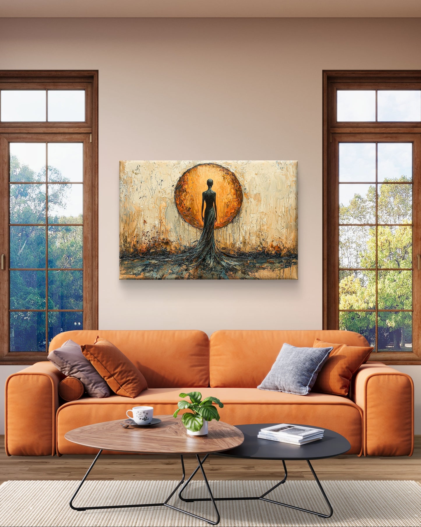 Een silhouet rijst op uit de aarde. In dit krachtige werk staat een vrouwelijke figuur, geworteld in het diepe, stil tegenover een vurige cirkel: de zon, de eerste bron, het begin van alles.
