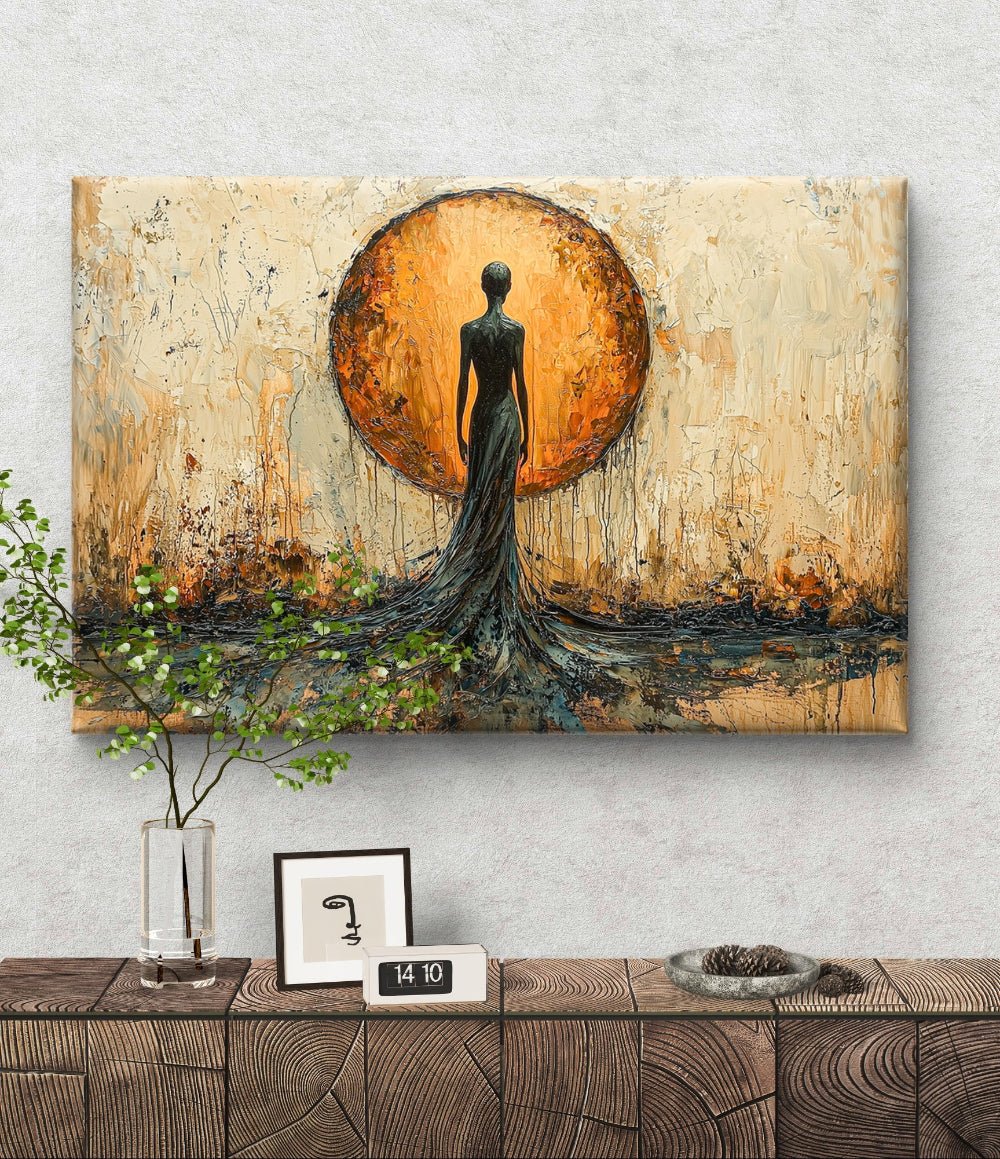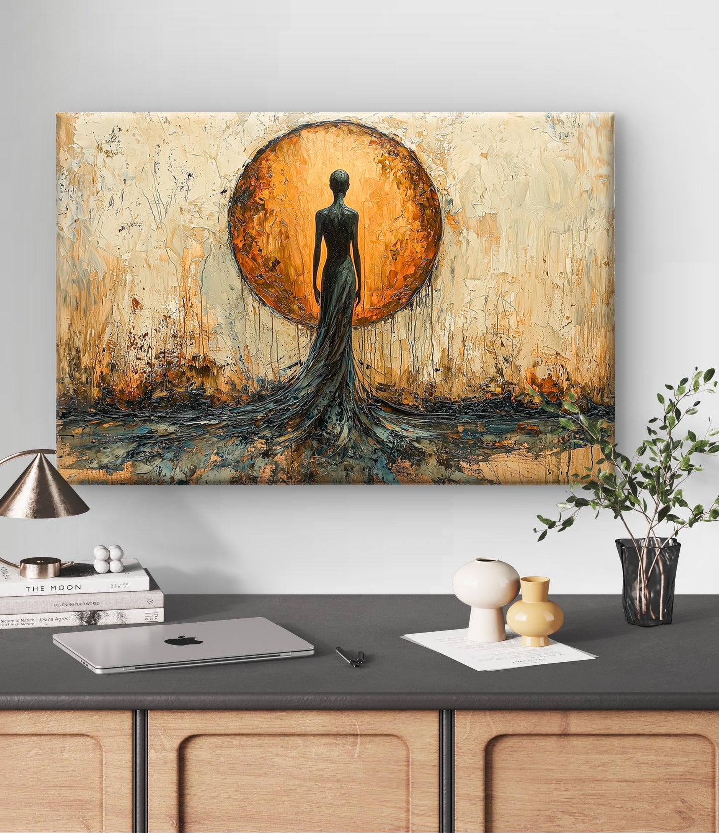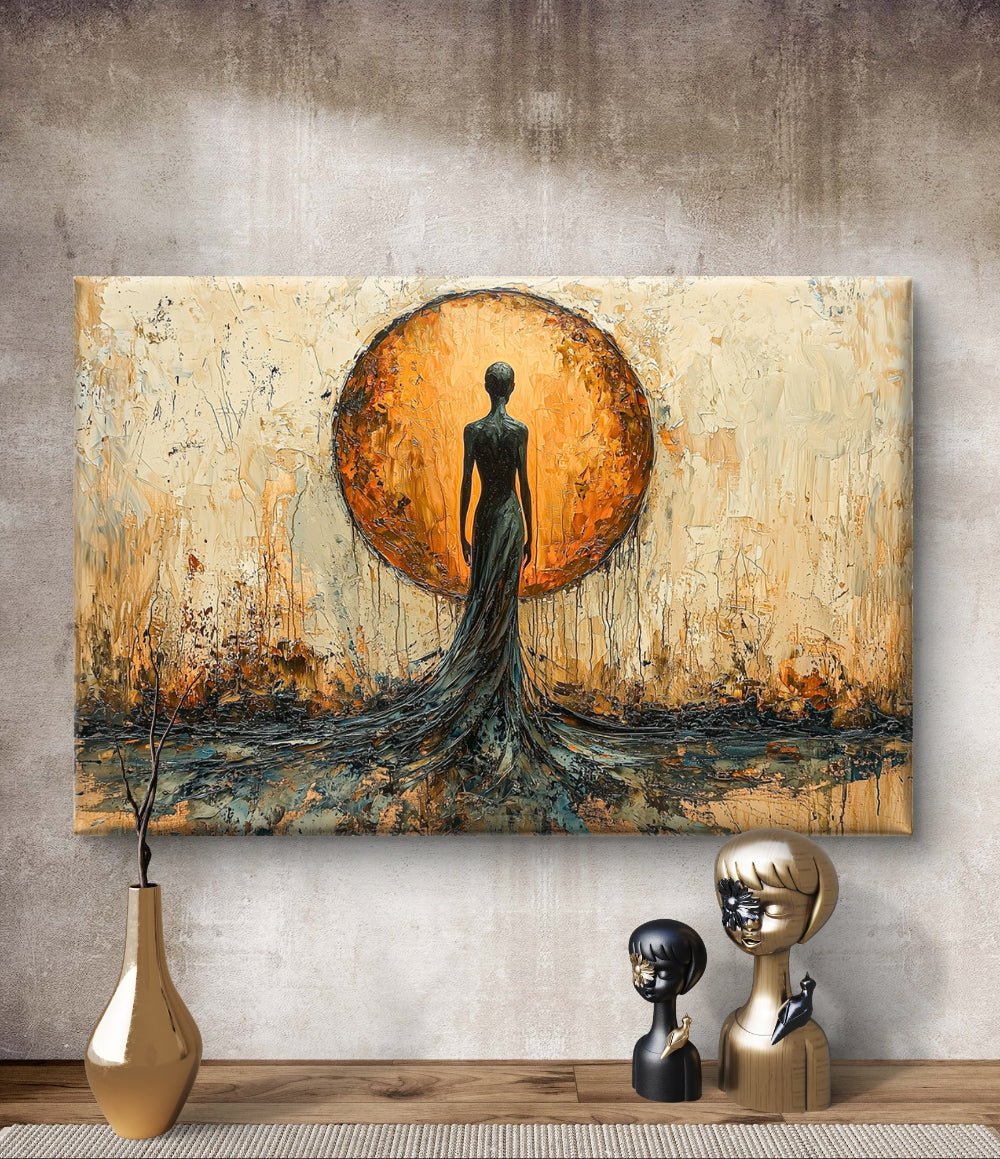 Een silhouet rijst op uit de aarde. In dit krachtige werk staat een vrouwelijke figuur, geworteld in het diepe, stil tegenover een vurige cirkel: de zon, de eerste bron, het begin van alles.