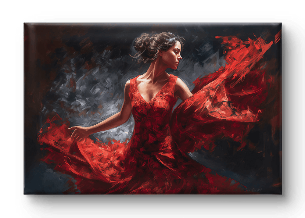 - Passie en elegantie: De dansende figuur in vurige roodtinten straalt energie en verfijning uit, perfect voor wie zijn interieur wil verrijken met kunst die raakt en inspireert.
