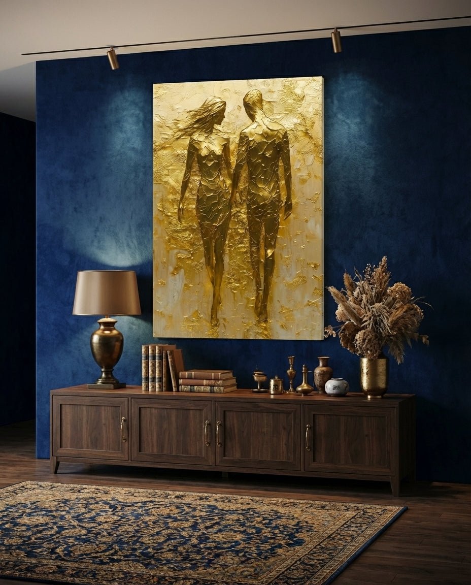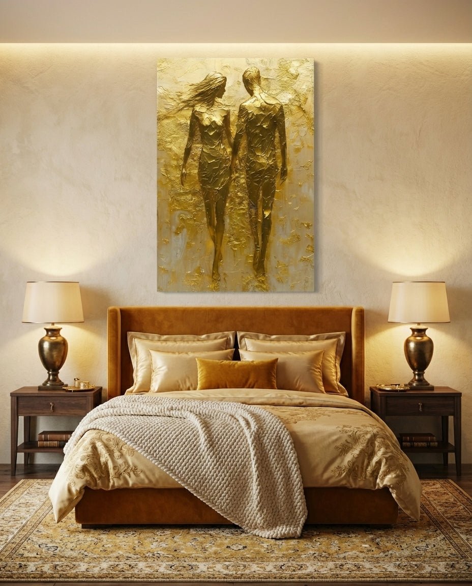 Twee figuren, volledig opgebouwd uit rijke gouden structuren, wandelen samen door een schitterend landschap van licht en textuur. De impasto-techniek geeft het werk een tastbare luxe en diepte: het lijkt alsof de figuren uit het doek komen en zich naar het licht toe bewegen.